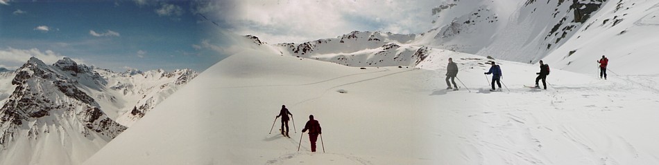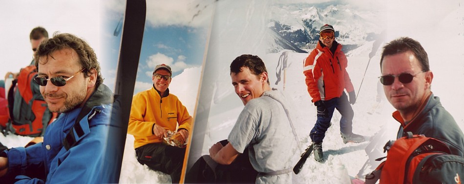 Nachdem wir uns alle wieder versammelt hatten, galt es noch das "verdächtige" Couloir mit grösstmöglicher Vorsicht; d.h. nur zu zweit und mit Entlastungsabständen zu befahren. Wie sich einige hundert Höhenmeter tiefer herausstellte, sollte nicht die eben befahrene Rinne das Haupthindernis des Tages darstellen, sondern eine kleine Triebschneeansammlung kurz vor dem vereibarten Treffpunkt. An dieser kleinen, nicht einmal zwei Meter hohen Gegensteigung, wurde etwelcher Skifahrerstolz gebrochen und bodenturnerische Glanzleistungen vollbracht. Ein grosses Gelächter und gegenseitige Spötteleien waren rundum zu hören. | |